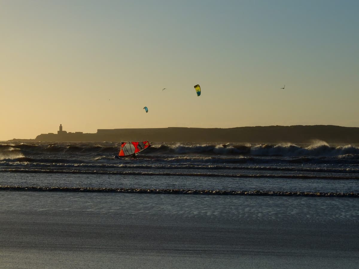 La plage principale d'Essaouira, directement accessible à pied depuis la médina, est idéale pour les débutants et les kitesurfeurs. Les vagues y sont généralement de 0,5 à 1,5 m, avec un fond de sable sans danger. Le vent du nord-est (alizé) y est constant de mai à septembre, ce qui en fait l'un des meilleurs spots de kitesurf de la côte atlantique africaine. Attention aux courants latéraux par fort vent : restez dans les zones délimitées par les écoles de surf.